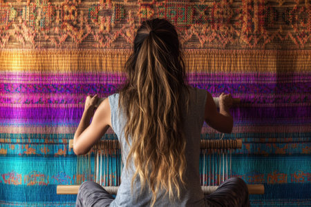 A woman sits at a loom, skillfully creating a colorful tapestry in a bright, artistic setting filled with fabric.