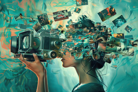 A young woman stars intently at the viewer, her face adorned with small photographs, creating a collage that reflects various moments.