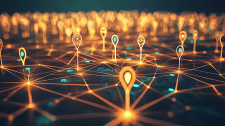This abstract image showcases a vibrant digital network with glowing geolocation markers. Perfect for technology and innovation themes, it represents connectivity in a modern landscape.
