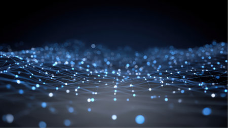 A network of connected points glows against a black background. The image displays a grid of illuminated nodes linked by lines, creating a sense of connectivity. This visual representation utilizes shades of blue and white, suggesting digital technology. It can be utilized for various commercial and editorial projects.
