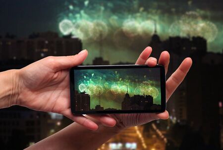 Fireworks in night sky and smartphone in hand
