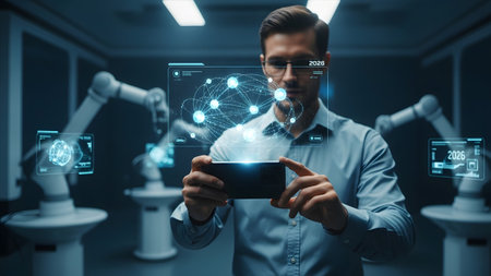 A man in a blue shirt uses a smartphone with a holographic network display in a lab with robots.