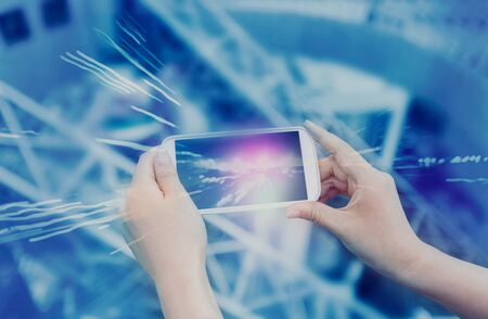 Double exposure of technology sketch hologram and woman holding and using a mobile device.