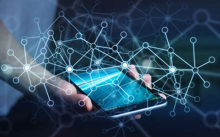Businessman on blurred background using circle igital data network with mobile phone