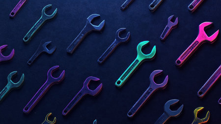 A visually striking flat lay of colorful wrenches arranged on a dark background, ideal for themes of mechanics, tools, and creative design.