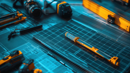 A captivating arrangement of engineering tools and blueprints set against a modern workspace backdrop, highlighting a blend of precision and creativity in design.
