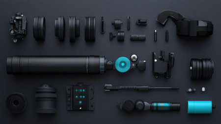 A dynamic arrangement of photography equipment and accessories displayed on a dark surface, showcasing vibrant details and modern design elements.