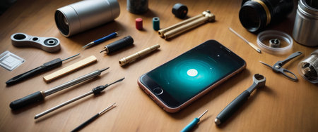 Smartphone on Desk with Various Tools and Gadgets