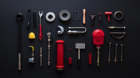 Collection of red and black tools arranged neatly on a dark background showcasing various equipment used in plumbing and repairs