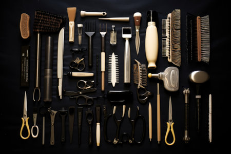 Professional hairdresser tools on black background. Top view, Hairdresser tools and accessories against a black background, viewed from the top, AI Generated