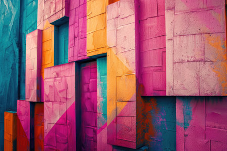 A close-up of a modern wall with colorful concrete panels forming a geometric pattern.