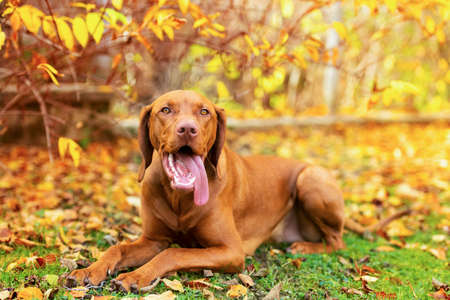 Cute hungarian vizsla puppy in beautiful autumn garden. Tired vizsla pointer dog lying down outside with his tongue sticking out.