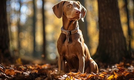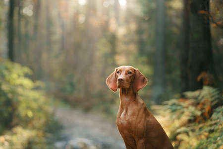 Hungarian Vizsla in the autumn forest. Pet in leaf fall. Atmospheric photo in nature