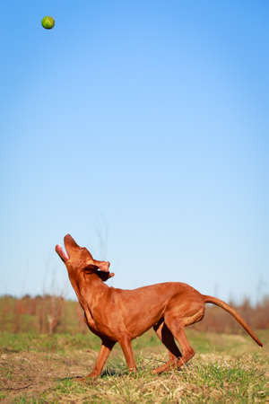 Dog plays with a round orange toy in a green field in spring. Cute active Hungarian Vizsla walking outdoor in a green grass in summer. Atmospheric photo of pet in move
