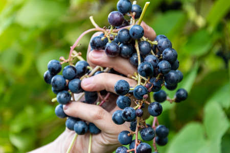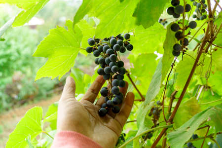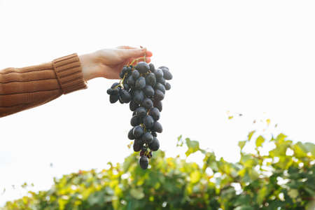 Harvest of grapes. A farmer's hand is cutting a bunch of blue grapes for local wine production at a nearby winery. Wine-making and restauration concept. Travel and agriculture background.