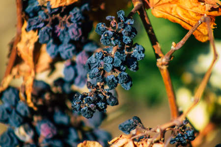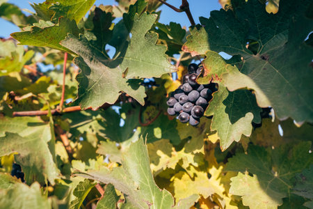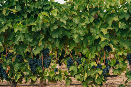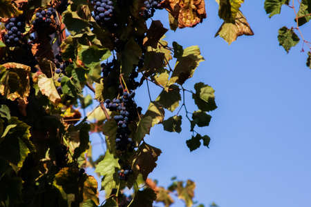 Blue wine grapes. Grapes for making wine. Detailed view of Cabernet Franc blue grape vines in the hungarian vineyard in autumn, Hungary