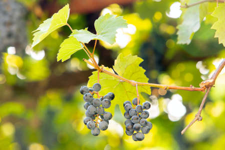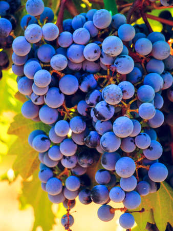 Bunch of blue grapes in the vineyard at sunset before harvest. Close-up