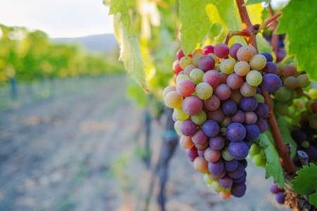 Bunches of ripe red grapes on vineyards at sunset.