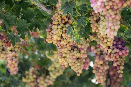Cluster of ripening grapes on vine in vineyard. Concept of winemaking, harvest, and agriculture for food and drink industries.