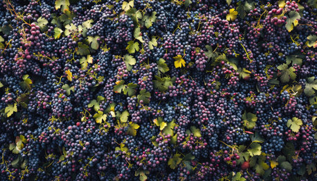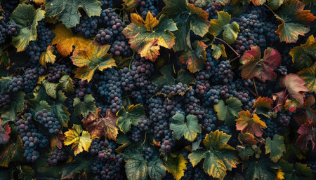 A close-up of the leaves and grapes on an autumn vineyard, with purple grape clusters creating a beautiful backdrop. The focus is sharp on these vibrant green leaves and dark blue berries against a blurred background of white blooming flowers and red wine-colored leaves. This scene captures the essence of fall in an idyllic countryside setting. --chaos 30 --ar 16:9 --v 6.1 Job ID: 156538c6-1a79-40bf-8fb9-f0c5d9651b00