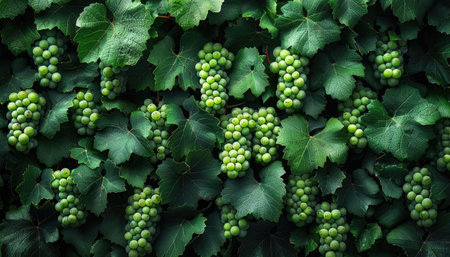Immature grapes growing on a dense grape vine