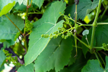 This close-up reveals a wild grapevine with small developing grapes and fine leaf details, capturing the essence of nature in vibrant green tones.