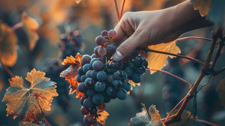 Close up of farmer s hands picking ripe grapes, showcasing textures and colors of leaves and fruits