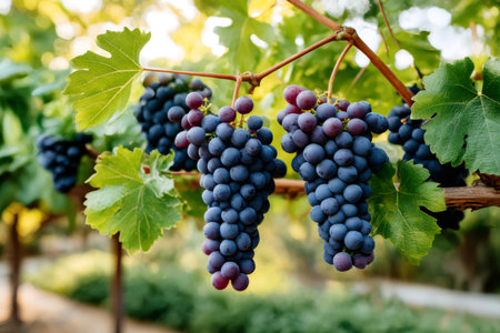 Ripe grapes hang on the vine in a sunny vineyard
