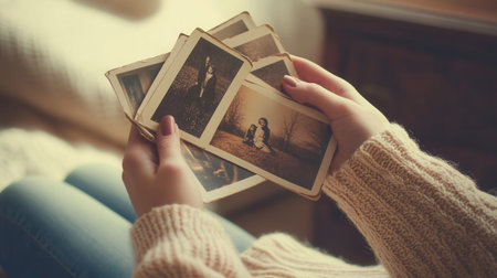 Hands hold gently old photographs that evoke nostalgia and a strong sense of sentimentality in a cozy atmosphere.