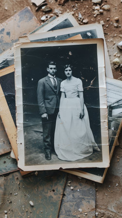 A poignant capture of vintage portraits showcasing a man and woman in a torn photograph. Natural elements enhance the nostalgic appeal, perfect for historical themes.