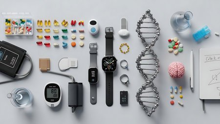High angle view of smartwatch and medical objects on grey background, 3d rendering