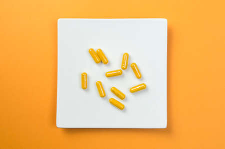 Yellow vitamin pills on orange background