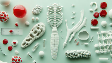 A visually striking arrangement of white and red medical models, including anatomical and biological shapes, on a soft green background, suitable for educational materials.
