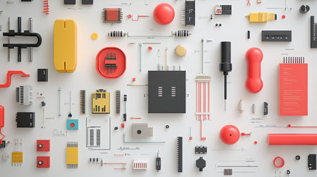 This image showcases a meticulously arranged collection of various small objects and components on a sleek white background, perfect for design inspiration.