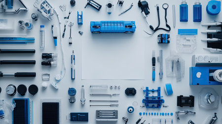 A top view flat lay of blue tools and equipment arranged on a workspace. Ideal for showcasing creativity, design, and industrial applications.