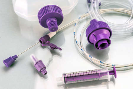 Dial flow next to a syringe at a hospital table, conceptual image