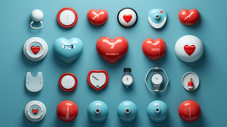 Set of various red, blue and white heart icons on blue background