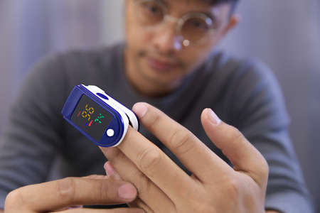 man using pulse oximeter device on finger,Oxygen Saturation Monitor use light pass through the blood in finger measuring amount of oxygen,healthcare concept,