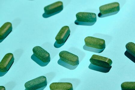 Heap of medicine tablets and pills on blue background. Healthcare or medicament addiction concept.