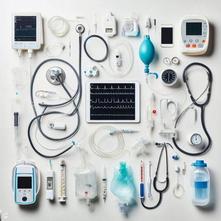 A collection of various electronic devices, including smartphones, laptops, tablets, and headphones, neatly arranged on a table, Collage of various medical equipment, AI Generated