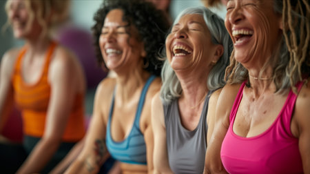 A vibrant gathering of women, showcasing a beautiful blend of ethnicities and styles, radiates positivity and energy in a fitness studio. Their beaming smiles and lively expressions create an uplifting atmosphere, inviting others to join in the celebration of health and community.