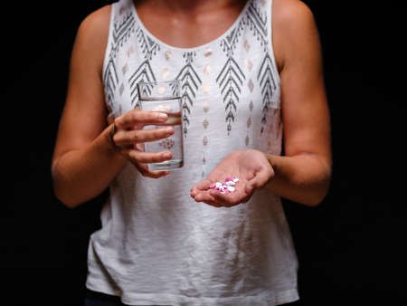 A girl holding colorful tablets on a black background. A young woman in a white blouse with a heap of painkillers and a glass of water in her hands. Medicine, suicide concept.