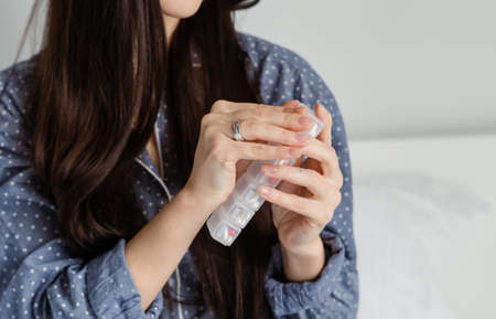 Cropped photo of young woman opening pill organizer to take vitamins for her health support in morning at home. Daily treatment, healthcare routine and pharmaceutical prescription concept