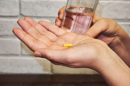 Vitamins of yellow color in a hand on a pink background. Behind - a glass of water. The concept of taking vitamins, dietary supplements, health promotion.
