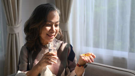 Close-up elder asia people or latin lady take daily omega essential cod liver fish oil, calcium pill, vitamin C D E sit relax at home sofa couch help benefit life balance for body diet weight loss.