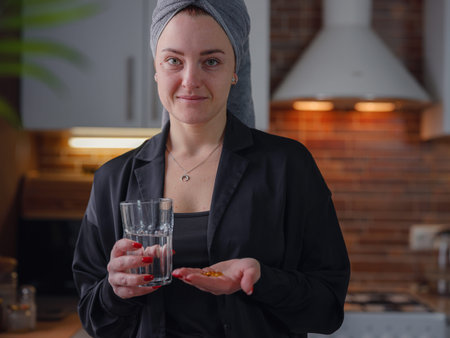 healthy eating concept with Asian woman taking fish oil hand holding capsule vitamin and a glass of water