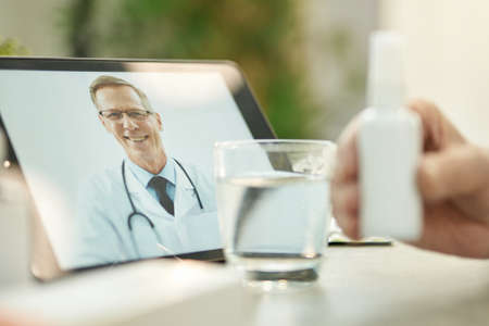 Doctor online video call explain treatment, symptom check with Asian patient woman connecting from home, using laptop computer in hospital office. Telemedical, Covid-19 new normal healthcare concept