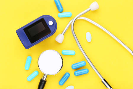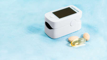 Diagnostics and treatment of coronavirus. The picture shows a pulse oximeter and pills in hand.