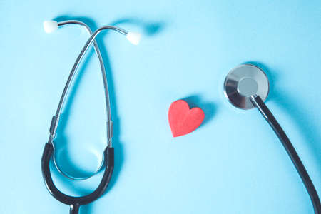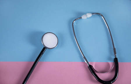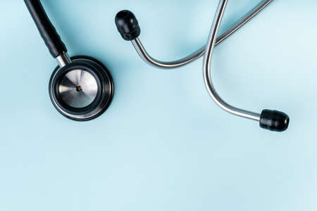 Medical stethoscope isolated on blue background. Diagnostic tool for doctor, listening to the lungs for inflammation. Health care concept. Copy space, top view, flat lay, banner.