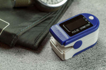 Pulse oximeter, digital device for measuring blood oxygen saturation and pulse rate on the finger. Medical research, close-up